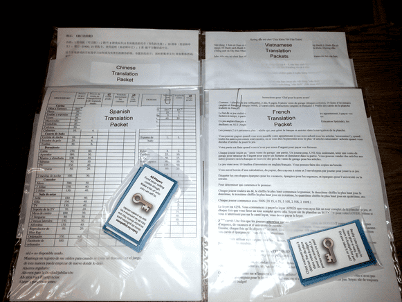 Available in Spanish, French, Chinese and Vietnamese. Includes translated: 10 inventory/check register; 25 Key cards; instructions, board squares. Players can take the board squares sheet, copy to an adhesive sheet, and cut and paste the squares onto the board itself. Or – just use it on the side as a help tool!